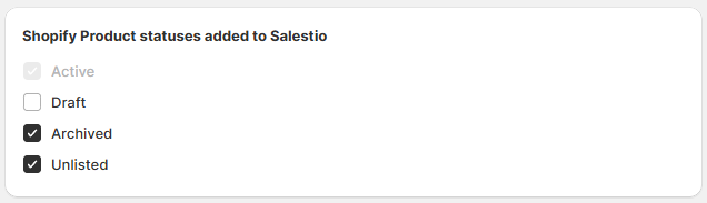 Salestio now supports the recently introduced Unlisted status in Shopify. It hides products from store search and collections, all sales channels, internet searches, and Shopify Catalog — while still allowing access via a direct URL.
